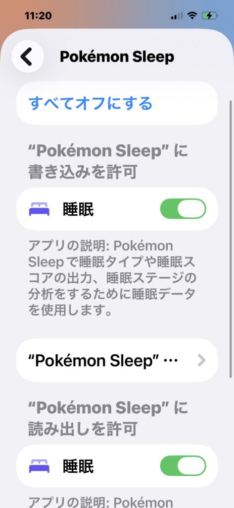 - “ヘルスケア”への書き込みを許可」 という見出しがあり、その下に 「睡眠」のスイッチ があるはずです。これを 「オン(緑色)」 にしてください。